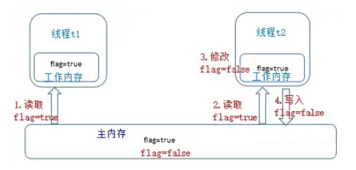 下图线程t1,t2从主内存分别获取flag=true,t1空循环,直到flag为false的时候退出循环。t2拿到flag的值,将其改为false,并写入到主内存。此时主内存和线程t2的工作内存中flag均为false,但是线程t1工作内存中的flag还是true,所以一直退不了循环,程序将一直执行。