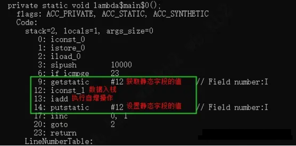 每个线程执行的逻辑是循环1万次,每次加1,那我们希望的结果是2万,但是实际上结果是不足2万的。我们先用javap命令反汇编,我们看到很多代码,但是number++涉及的指令有四句,具体看第二张图。