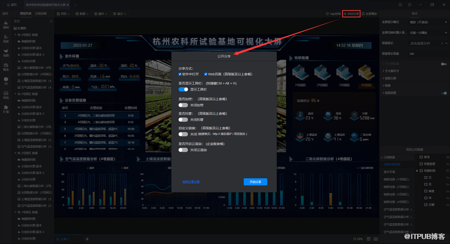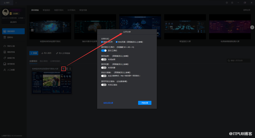 如果需要分享大屏的话可以在软件首页选中 “项目” 分享大屏,也可以在大屏编辑界面分享大屏。值得注意的是: 在未开启 “ 托管 ” 的情况下,需要保持分享方的电脑和软件处于运行状态,同时分享方的网络环境决定了接收方在什么网络环境下可以打开分享链接 。
