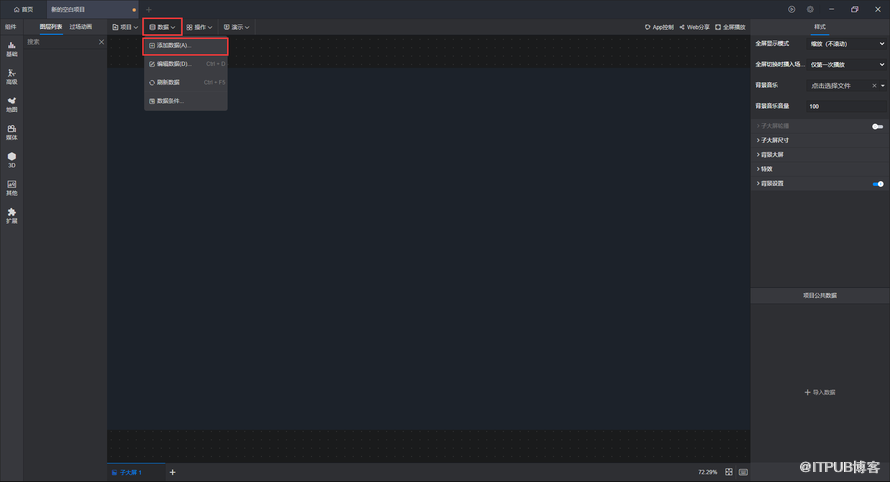 我们需要使用“添加数据”功能来将所需数据进行导入。数据是大屏制作的基本,但是你也可以选择先对大屏本身进行设置,再对数据进行导入。