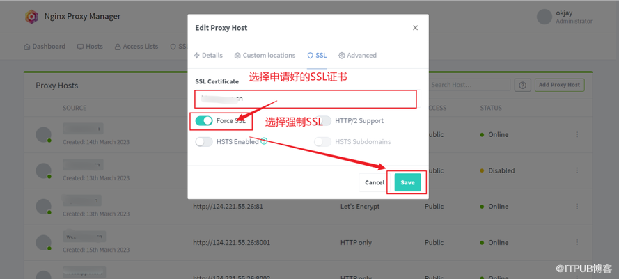 进入反向代理设置界面,编辑上文创建的反代服务,选择SSL选项,下拉菜单中选择我们申请的证书,然后可以勾选Force SSL即强制HTTPS。