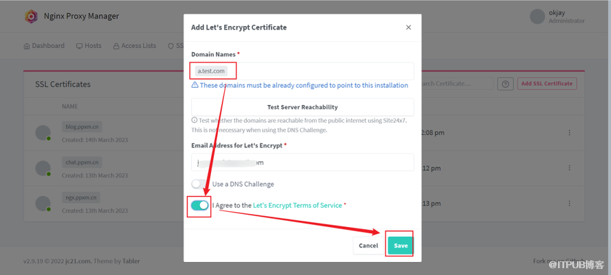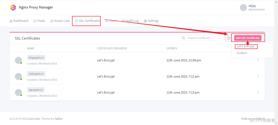 在Nginx Proxy Manager管理后台,选择Access Lists->Add SSL Certificate->Let's Encrypt选项。