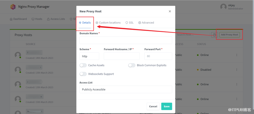 点击右边Add Proxy Host ,在弹出的界面Details选项中填写相应的字段。