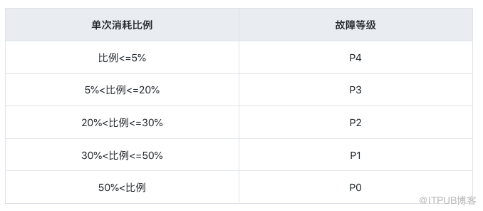 比如 ErrorBudget为25000,问题产生错误请求超过5000,也就是消耗20%以上既可以定级为P2级以此类推。