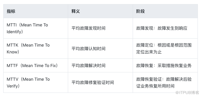 其实MTTR还可以细分4个指标,分别对应系统故障中四个阶段,具体如下