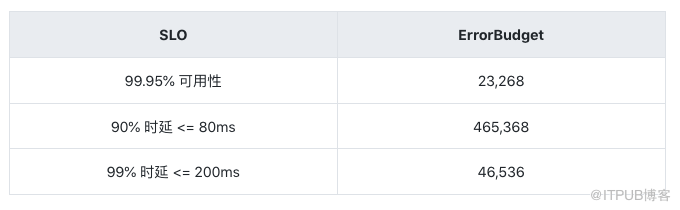 比如 4周为一周期,应用的请求次数是 4,653,680,反向推导以下SLO得出 ErrorBudget 如下: