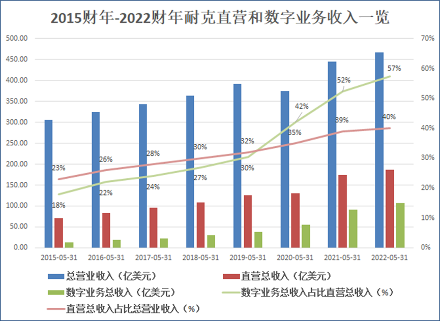 直营收入占比总收入由2015财年的23%稳步攀升至2022财年的40%,数字化渠道收入占比直营收入则增长至57%,耐克预计2025财年业务整体的数字化程度将提升至50%。不难看出,数字化已然成为耐克保持增长的重要引擎。