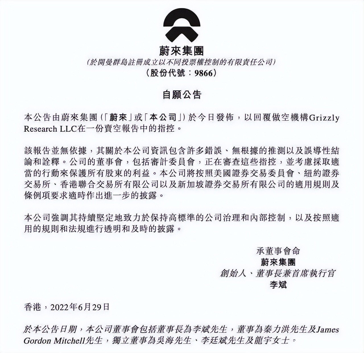 对于以上这些指控,6月29日蔚来官方在港交所发布公告回怼,表示灰熊的指控毫无依据,其关于公司资讯包含许多错误、无根据的推测以及误导性结论和诠释。
