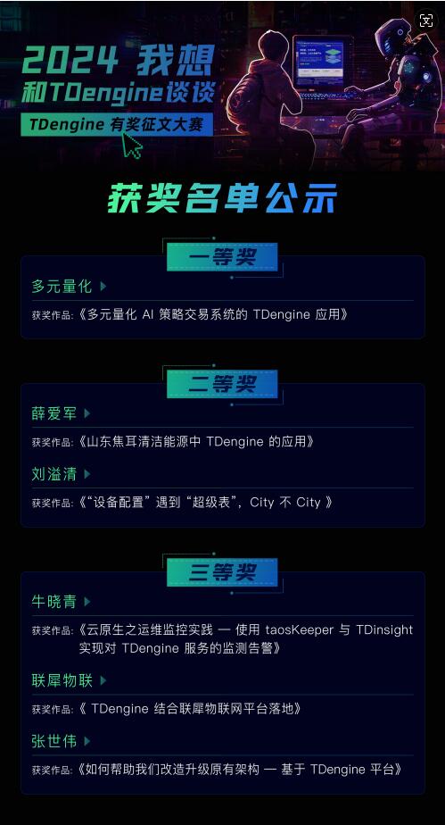 在大家的热烈参与下,为期一个多月的“2024,我想和 TDengine 谈谈”征文活动圆满结束??。在本次活动中,我们共收到数十篇高质量的稿件,经过评审团的严格筛选,前六名投稿人脱颖而出?。