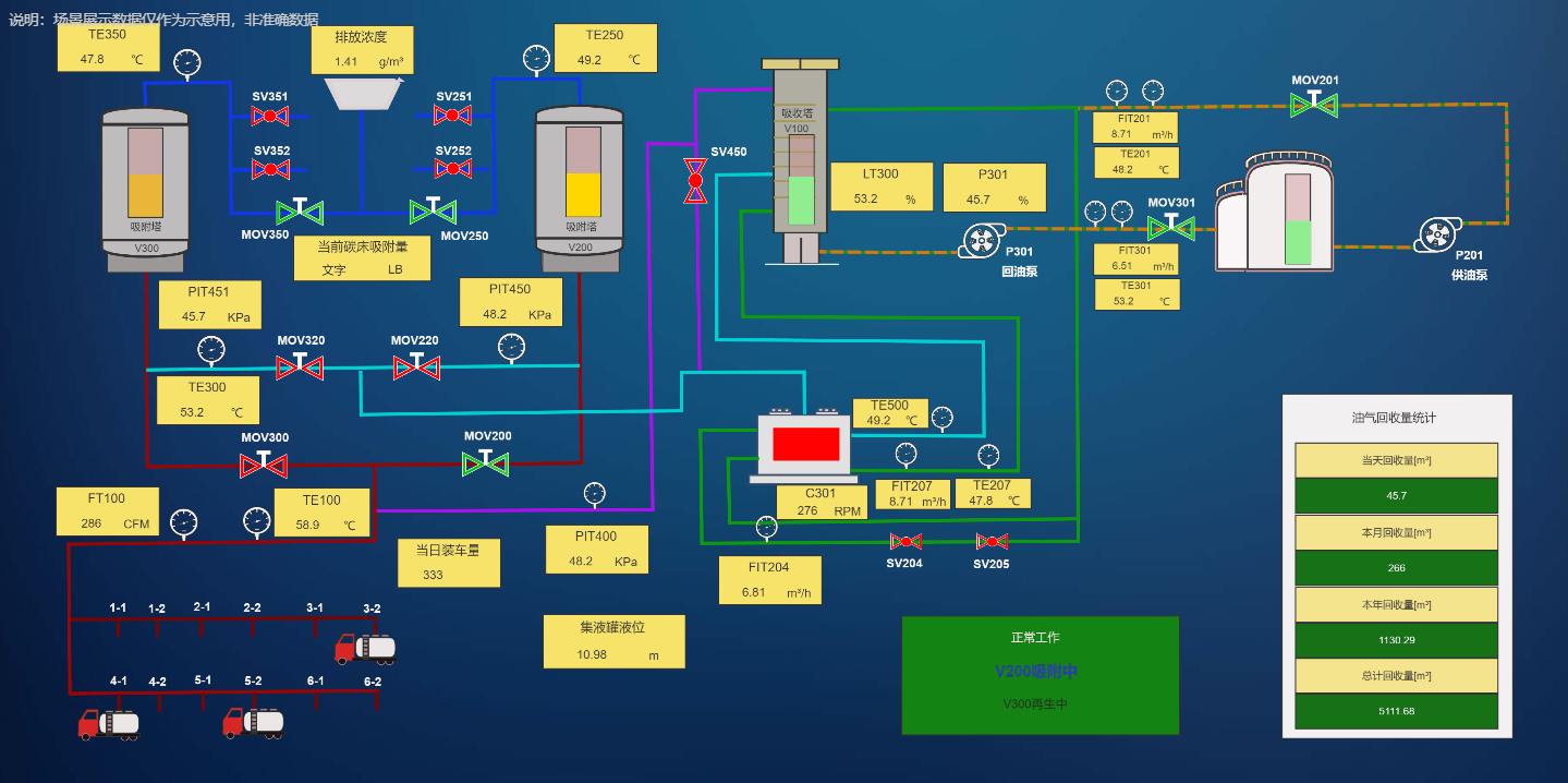 智慧油气井监测系统主要包含了单井实时监控和集油间实时监控配套的支持系统,用户可以根据系统搭建的石油开采运行流程来控制紧急关井和紧急开井的开关。将清管阀、紧急切断阀等设备、管线及其他生产相关的信号采集处理器进行直观呈现,实时更新设备运行效率、机组实时功率等数据,实现对石油开采动态数据进行科学、有效、自动化的生产与管理。