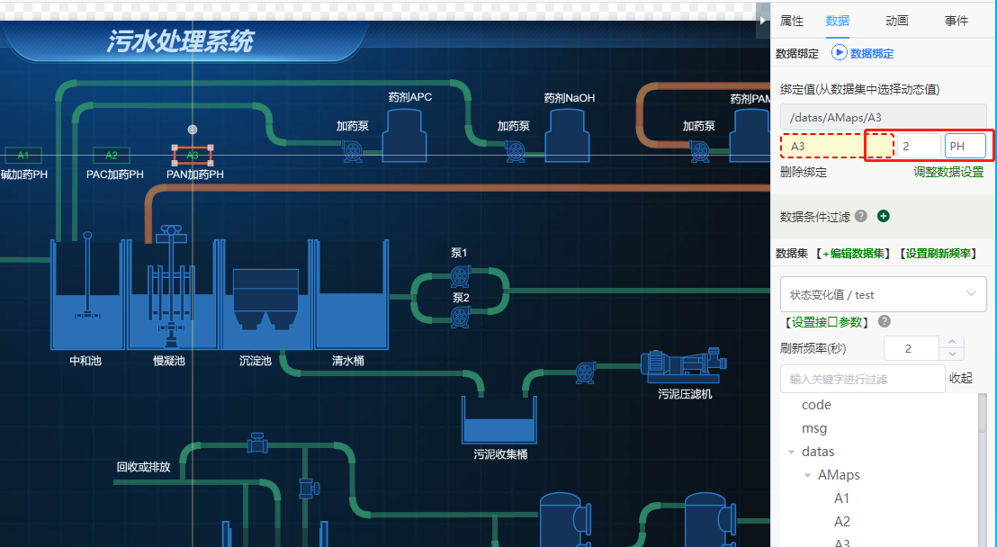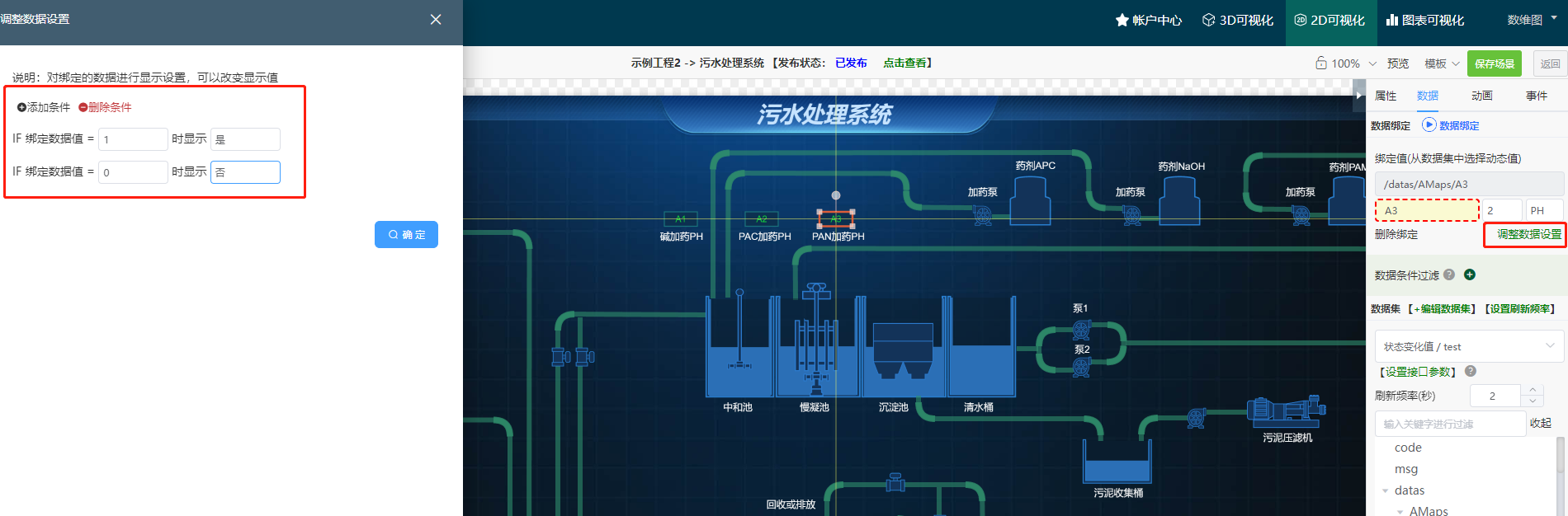// 场景中绑定的动态数据文本,可通过设置条件修改显示的值,如 当值=‘1’显示“是”,当值=‘2’显示“否”。如下图:
