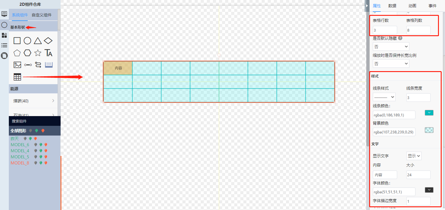 具体操作:从组件库中直接拖拽“表格”组件到场景中,通过属性配置可以调整表格的行和列,还可定义表格样式属性“颜色、线条、字体”等。