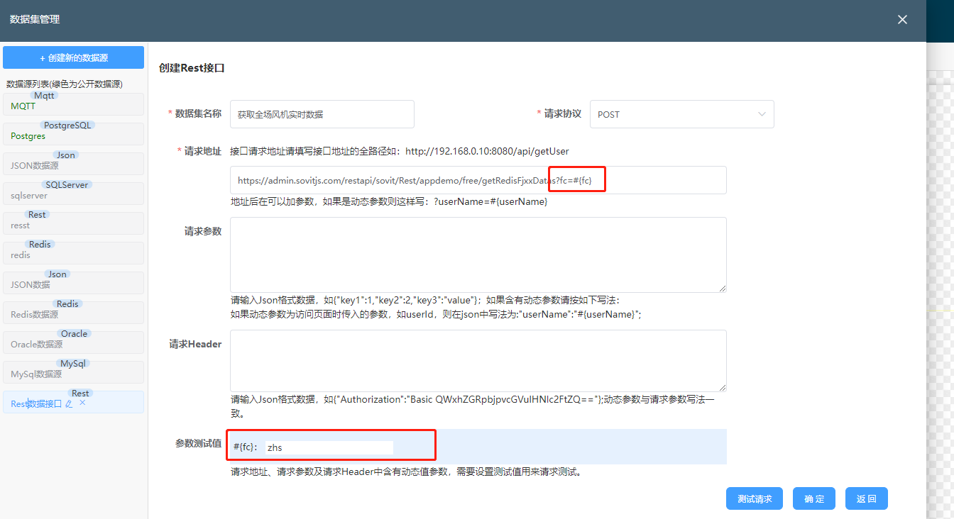 // 数据接口定义中可以设置 动态参数,同时在设置动态参数时必须填写一个 默认值用来查询,如下图: