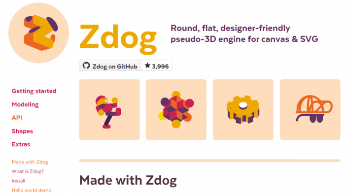 Zdog是一个用于画布和SVG的3D JavaScript引擎。Zdog是一个伪3D引擎,其中几何体以3D形式存在,但呈现为平面形状。