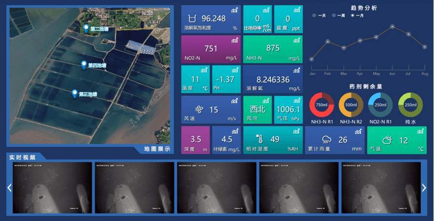 智慧渔业是以统一管理、提升效率为基准而建立的综合性信息展示平台,由各类监测数据、管理数据汇总后形成,为管理者提供准确、及时、全面的数据展示服务。