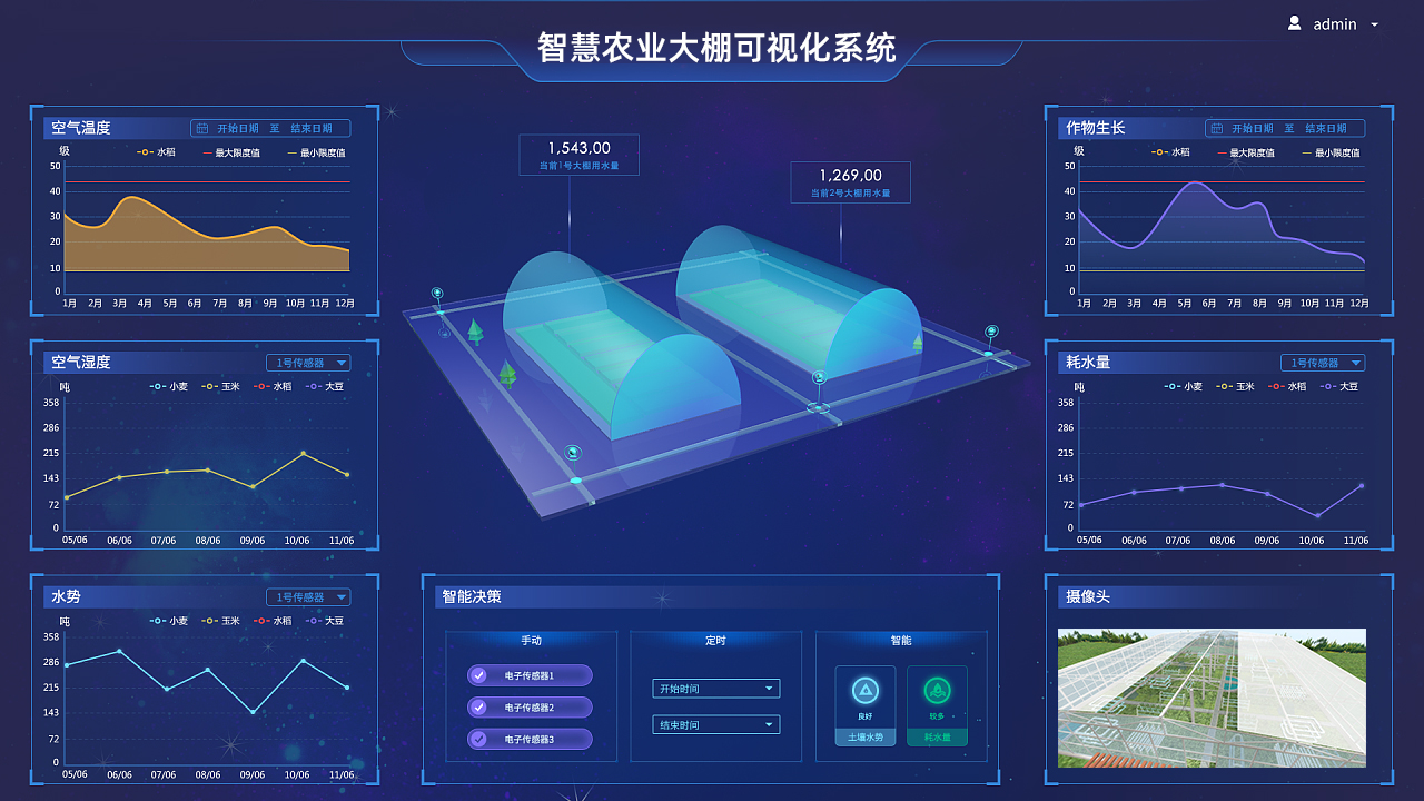 以3D可视化技术为基础,构建建筑、大棚、设备的逐级可视;统一整合视频监控、设备监测等各种信息系统,对集成数据按标准进行验证,对信息进行实时更新;建成智慧农业大棚的三维场景、监控等一体化的展示平台。实现农业产品过程的全面信息化,达到提高农作物质量和管理水平、从而提升核心竞争力的目的。