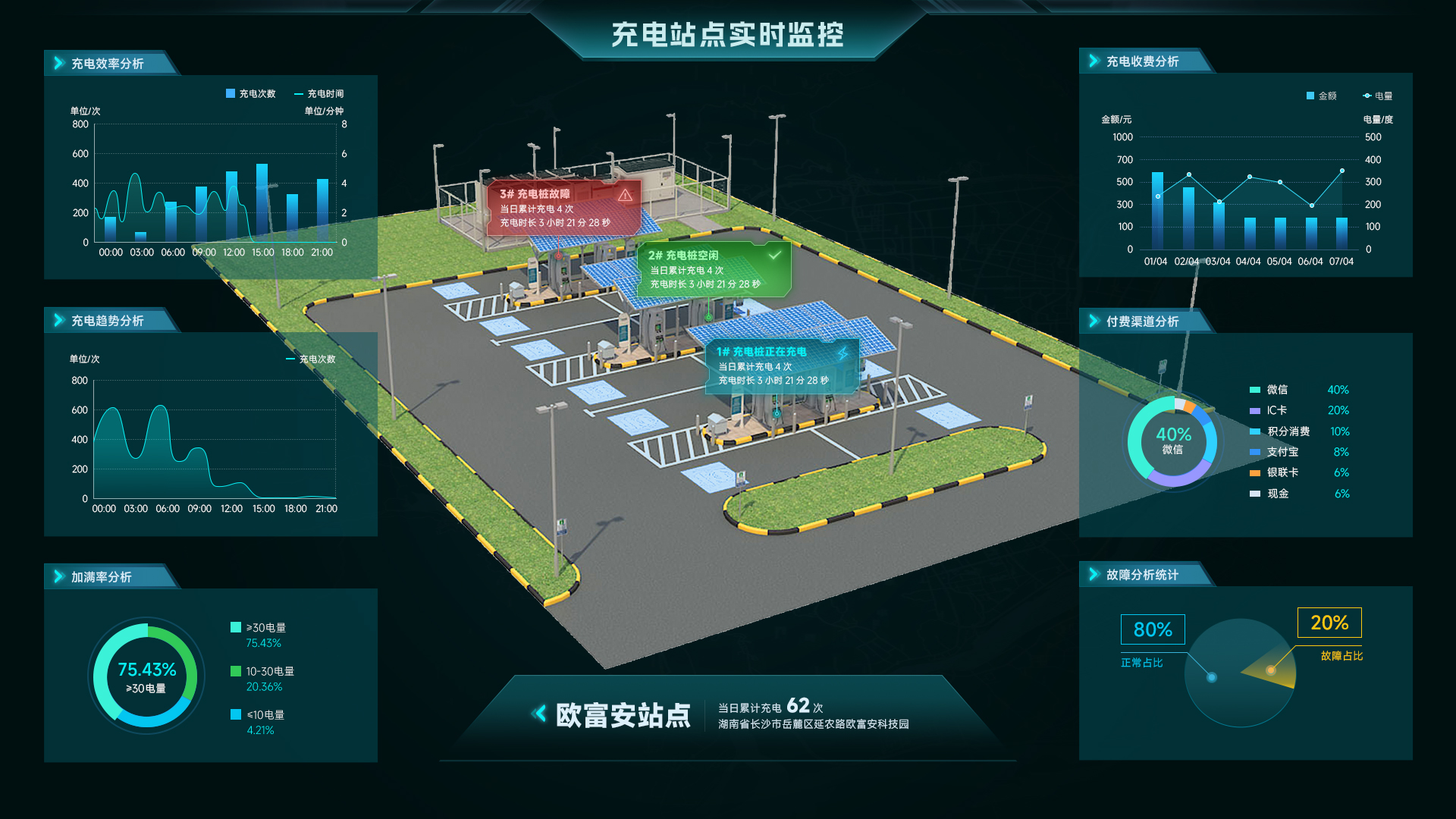 基于物联网技术,实时采集场站内充电桩等设备的实时数据,对设备的运行状态、故障信息进行可视化展示,系统打破数据孤岛,对场站间设备功率、充电情况、故障情况等进行及时、准确监测,为决策者科学管理设备、优化用电决策提供支撑。