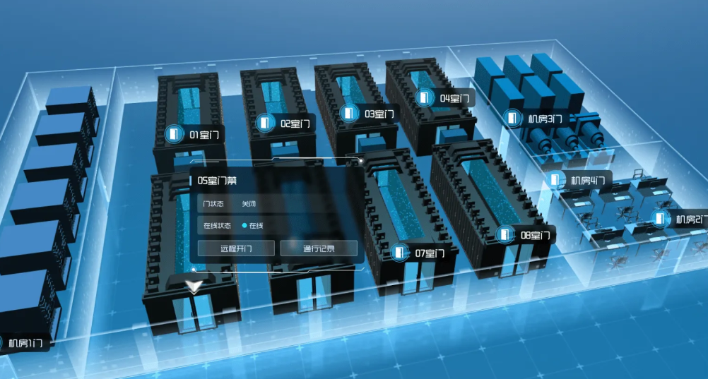 接入门禁识别系统,采集各机房的门禁状态、通行次数等数据,辅以 2D 面板配合展示门禁数量、故障记录、监控画面等信息。当系统识别到非法入侵时,触发告警,通过门禁点位声光报警等形式提醒运维人员及时处理。