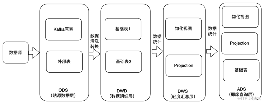 其 实 在 该 架 构 中 , 可 以 将 接 入 K a f k a 原 表 和 外 部 表 的 数 据 理 解 为 O D S ( 贴 源 数 据 层 ) , 将 经 过 数 据 清 洗 转 换 后 的 基 础 表 理 解 为 D W D ( 数 据 明 细 层 ) , 将 基 于 基 础 表 衍 生 的 物 化 视 图 和 p r o j e c t i o n 等 统 计 数 据 理 解 为 D W S ( 轻 度 汇 总 层 ) , 基 于 视 图 我 们 还 可 以 接 着 构 建 视 图 , 表 和 p r o j e c t i o n 。