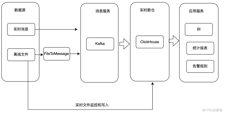 对 于 数 据 源 为 离 线 文 件 的 情 况 , 有 两 种 处 理 方 式 , 一 种 是 将 文 件 转 为 流 式 数 据 写 入 K a f k a , 另 外 一 种 情 况 是 直 接 将 文 件 通 过 S Q L 导 入 C l i c k H o u s e 集 群 。