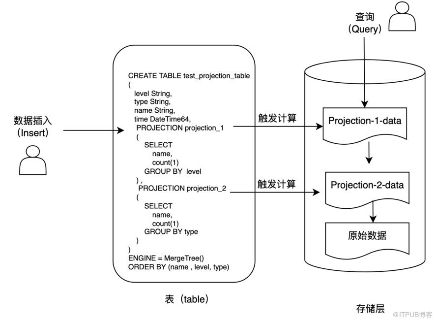 上 述 代 码 在 定 义 表 的 时 候 定 义 了 p r o j e c t i o n _ 1 和 p r o j e c t i o n _ 2 , 其 中 p r o j e c t i o n _ 1 在 l e v e l 维 度 对 数 据 进 行 汇 总 , p r o j e c t i o n _ 2 在 t y p e 维 度 对 数 据 进 行 汇 总 。 在 创 建 好 p r o j e c t i o n 后 还 可 以 对 p r o j e c t i o n 进 行 修 改 。