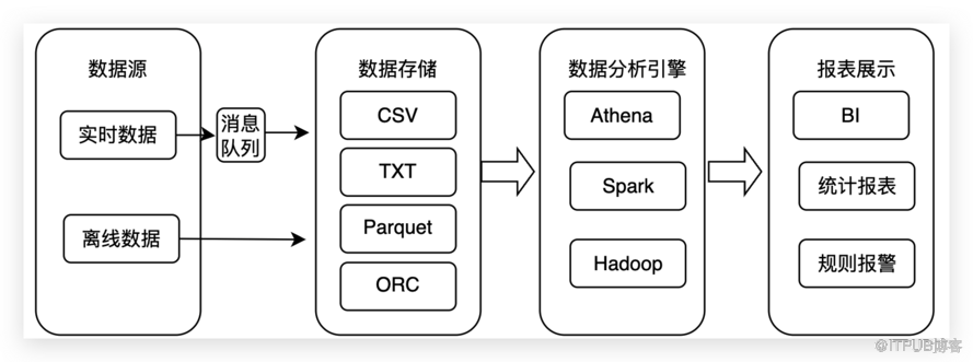 查 询 的 时 候 通 过 A t h e n a 、 S p a r k 或 者 H a d o o p 进 行 查 询 分 析 。 最 终 分 析 的 数 据 用 于 B I 、 统 计 报 表 和 告 警 规 则 等 。