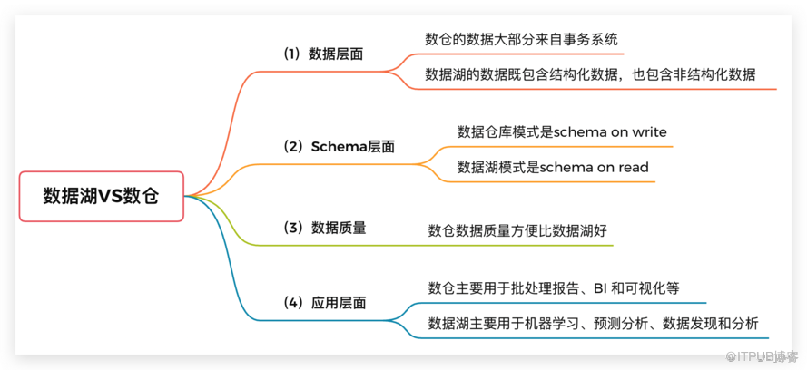(4)应用层面: 数仓主要用于批处理报告、BI 和可视化等;数据湖主要用于机器学习、预测分析、数据发现和分析。