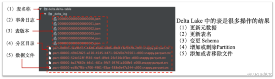 Delta Lake会以日志的形式将所有的操作存储在表中。也就是说当前表中的数据是一些列历史操作的结果,为Delta Lake表的结构信息。 其中包含了表名称、事务日志(每个事务日志文件代表了一个数据版本)、分区目录和数据文件。