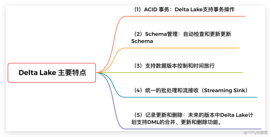 Delta Lake 解决了数据湖面对的问题,简化了数据湖构建。下面咱们看下 Delta Lake 的主要特点,具体包括ACID 事务、模式(Schema)管理、数据版本控制和时间旅行、统一的批处理和流接收、记录更新和删除。其中ACID 事务、模式(Schema)管理和统一的批处理和流接收是Delta Lake 设计的核心要点,需要同学们重点关注。