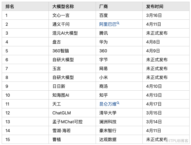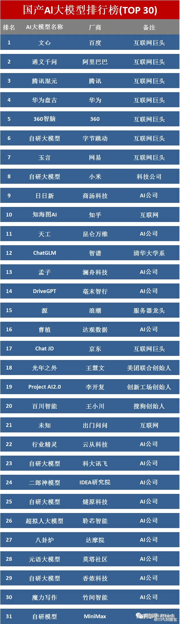 抛开这些,从模型规模、模型效果、市场占有率等多个角度,百度的文心一言、华为的盘古、阿里的通义千问、腾讯的混元排在前四,应该是比较合理的,至于后面的排名,就不大能保证了。不过下面的排名也可以参考一下: