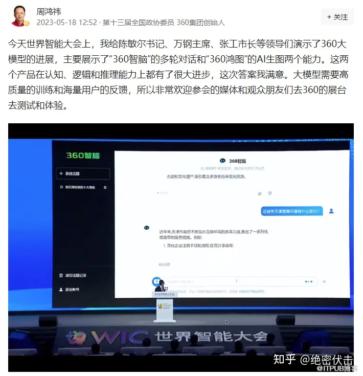 而在世界智能大会上,周鸿祎展示了“360智脑”的多轮对话和“360鸿图”的AI生图两个能力。
