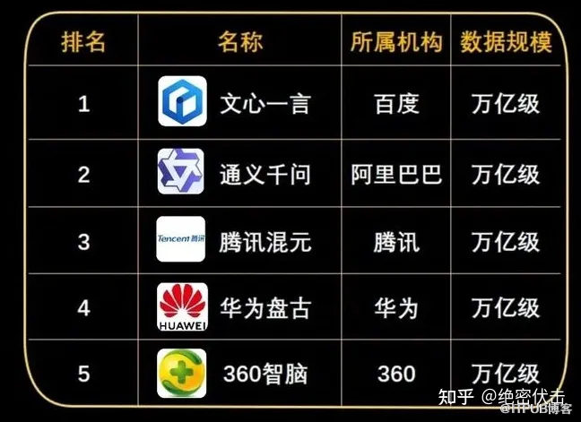 之前有媒体给出了目前国内Top-5的大模型公司,分别是: 百度的文心一言、阿里的通义千问、腾讯的混元、华为的盘古以及360的智脑。