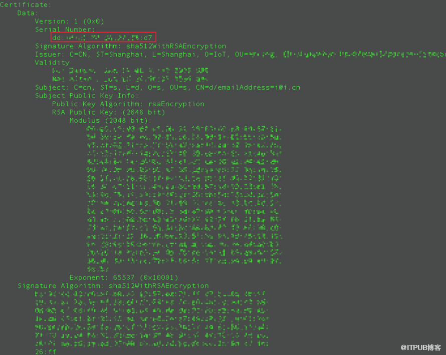 # 生成pem的私有key openssl genrsa -out device-1.key 2048 # 生成设备证书CSR openssl req -new -key device-1.key -out device-1.csr -newkey -subj \ "/C=CN/ST=Shanghai/L=Shanghai/O=IoT/OU=iot/CN=dn3023842" # -set_serial 指定序列号 # 用私有CA签发设备证书CRT openssl x509 -req -in device-1.csr -CA myIoTCARoot.crt -CAkey myIoTCARoot.key -CAcreateserial -out device-1.crt -days 3650 -sha512 # 查看设备证书SN openssl x509 -noout -text -in device-1.crt