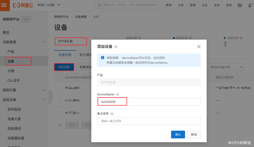 基于已创建的空气净化器产品,添加设备,输入设备deviceName。