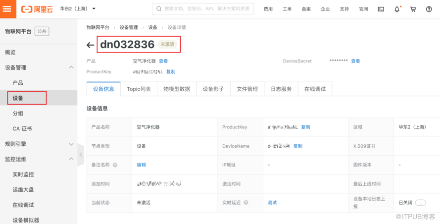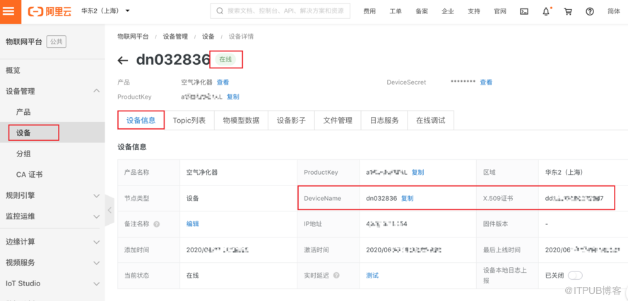 设备启动,联网后,我们可以在IoT物联网平台控制台查看设备当前状态为在线,X.509证书栏为绑定设备证书的序列号,如下图。