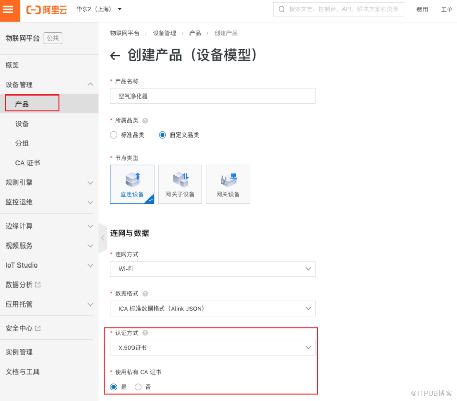 - 选择直连设备,认证方式选择 X.509证书, 使用私有CA证书勾选 是。