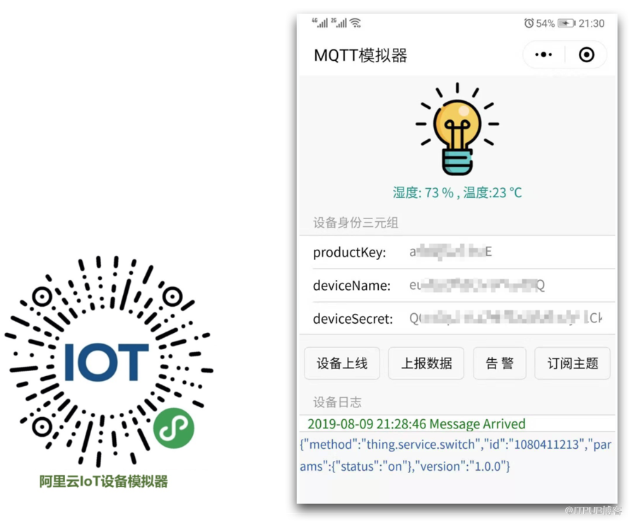 ③ 微信小程序:MQTT模拟器 扫码,自动填入设备身份。