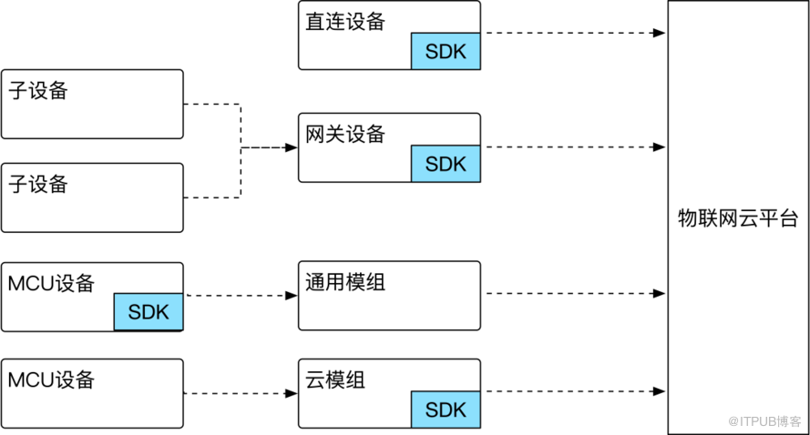 子设备与网关设备:子设备无公网IP,通过局域网与网关通信,由网关代理上云,网关需集成集成LinkSDK