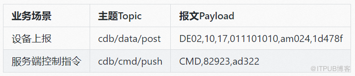 设备端publish业务数据到MQTT集群,流转到后端业务服务器处理;业务服务器把指令发布到MQTT集群,触达到设备端。具体业务数据定义如下:
