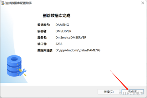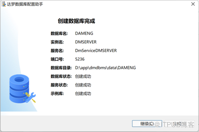 说明:如果点击“完成”,创建数据库完成,自动关闭此图形化界面;如果点击“继续”,会继续弹出“达梦数据库配置助手”界面。