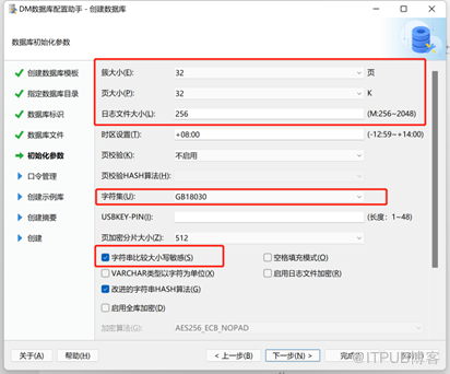 说明:建议使用如下的优化参数:簇大小(E):32页,页大小(P):32K,日志文件大小:1024或2048M,字符集:GB18030,字符串比较大小写敏感:选中。