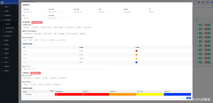 平台内置LEC研判法和LS研判法两种风险研判方法,对查找到的风险点进行诊断分析,研判分级为红、橙、黄、蓝四个等级。绘制的风险四色图,通过可视化大屏展示风险点级别、位置、分布情况,严密监测风险点动态。