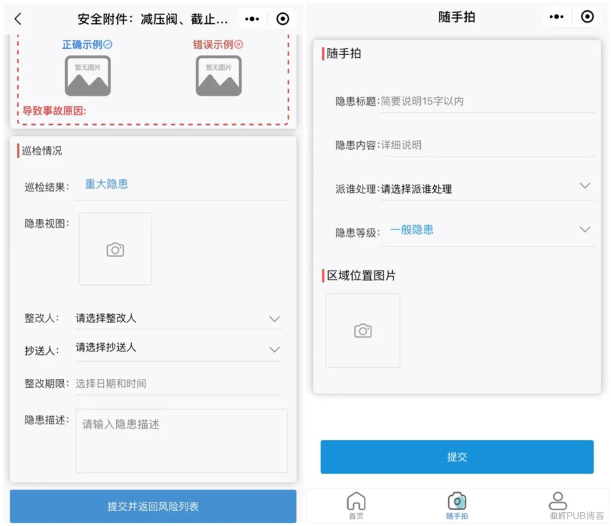员工巡检时,如果出现隐患,可拍摄照片以及文字描述隐患情况,并完善整改期限、整改人等信息后上报隐患。隐患上报后,整改人在手机APP端及时收到整改提醒,在离线的情况下,也能保存隐患信息及时上传。