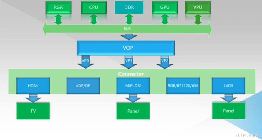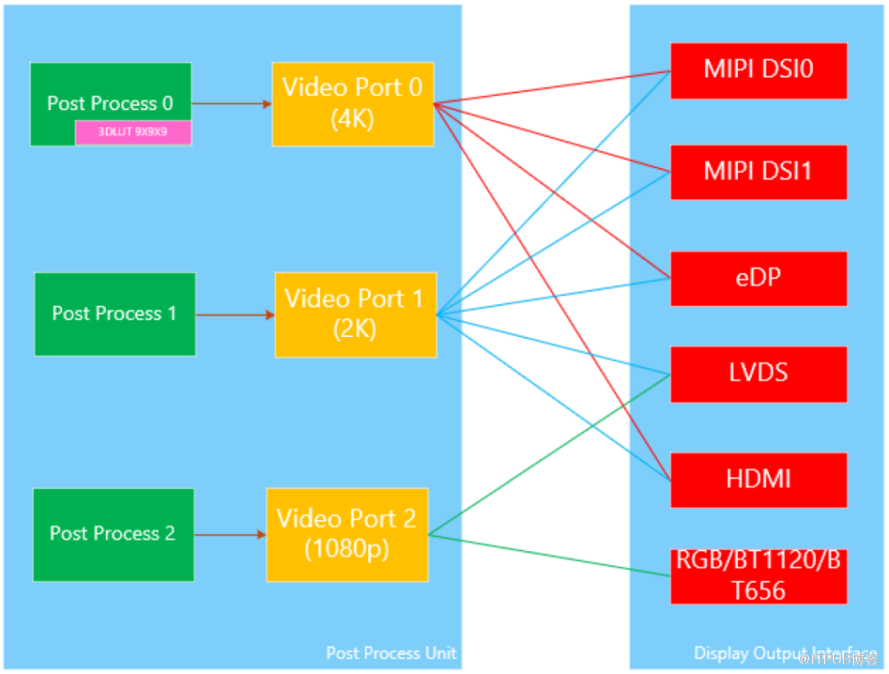 显示子系统是 Rockchip 平台显⽰输出相关软硬件系统的统称,它包括 VOP 和 RGB、BT1120、BT656、I8080(MCU 显⽰接口),LVDS、MIPI DSI、EDP、DP、HDMI 等显⽰信号输出模块以及与之对应的软件驱动。