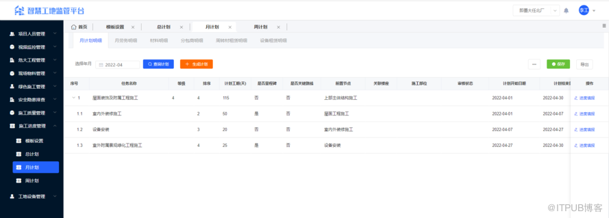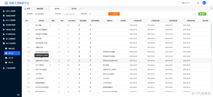 在系统PC端拟定进度计划(包括多级管理的子计划),各任务之间相互联系,相互影响。系统根据进度计划自动生成甘特图,根据进度完成情况,自动统计分项进度情况,对逾期任务自动预警和消息推送,任务负责人定期在APP反馈项目进度,方便项目管理人员查看进度的实施情况,实时把控各进度的走向,确保整体工程在计划的项目周期内完工,形成进度精细化管控。