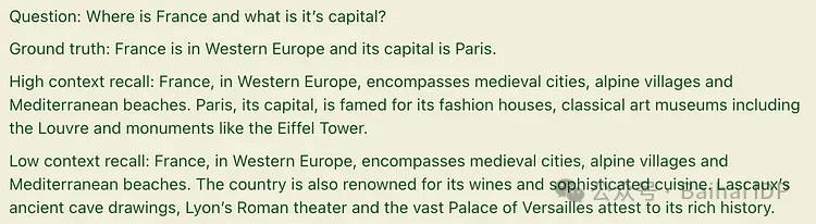 此外,RAGAs 网站[2]还介绍了另外两个指标:Context Precision(译者注:上下文精确度,即生成的模型响应中有多少是与上下文相关的)和 Context Recall(译者注:上下文召回率,生成的模型响应中有多少能够涵盖上下文相关的信息)。