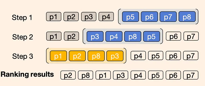 图 4 :使用滑动窗口对 8 个段落进行重排序的示意图,滑动窗口大小为 4,步长为 2。 蓝色框代表前两个窗口,黄色框代表最后一个窗口。滑动窗口的应用顺序是从后向前的,这说明前一个窗口中的前两个段落将参与下一个窗口的重排序。