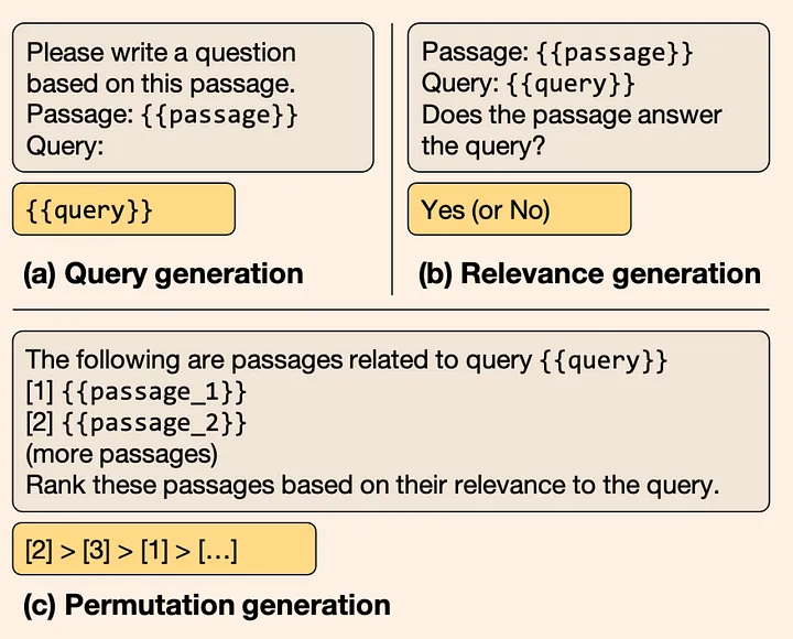 图 3:这些 instructions 说明了如何使用未经预训练的 LLM 执行特定的重排序任务。灰色框和黄色框表示模型的输入和输出。(a) Query generation 这种方法让 LLM 根据文档内容,使用其通过计算和学习得到的对数概率值来生成与该段落相关的 query 。 (b) Relevance generation 让 LLM 评估给定的文档段落与 query 之间的相关性,并输出相关性程度。(c) Permutation generation 会对一组文档段落进行重排列,并生成一个按照相关性排名的文档段落列表,以便确定哪些文档段落最适合给定的query。