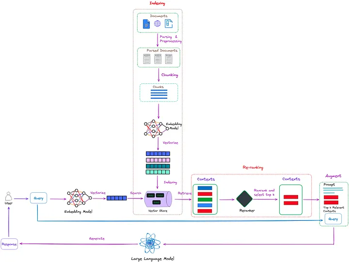 图 1:RAG 中的重排序技术,其任务是评估这些上下文的相关性,并优先选择最有可能帮助模型响应更准确并相关的上下文(红框标注部分)。图片由原文作者提供。