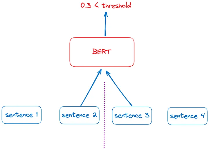 如果 BERT 模型对这两个句子的预测得分低于预设的阈值,则表明两个句子之间的语义关系较弱。预测结果可以作为 text segmentation point (译者注:根据预测结果确定的可以分割文本的位置,即划分两个句子的位置。),如图 3 中句子 2 和句子 3 之间的虚线所示。